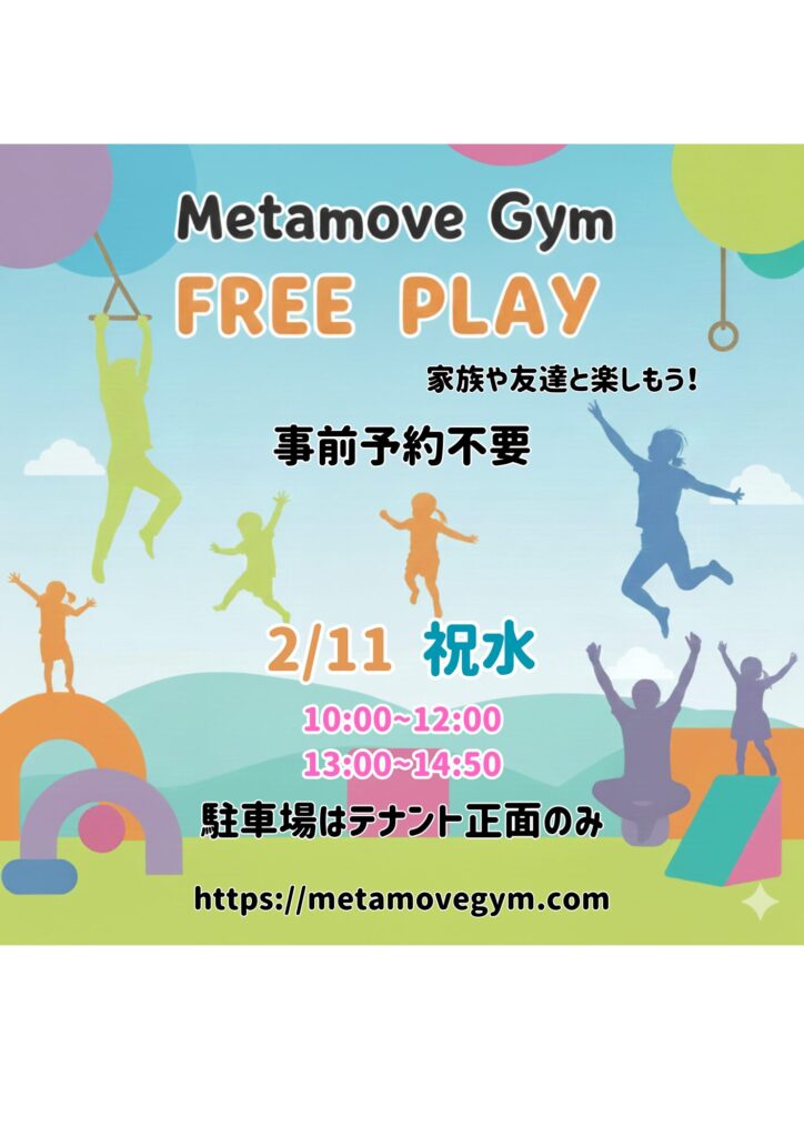 2月フリープレイ開放日 07.01.2026 最終更新日時 : 08.01.2026 metamovegym 2月のフリープレイ開放日はこちら! フリープレイは、指導などはなく、子どもたちが公園で自由に遊ぶように、体操器具を使って遊べる空間です。 是非家族やお友達と一緒に遊びにいらしてください^^ 実施日:2/11(祝水)10:00~12:00,13:00~14:50 会員:300円/1h 非会員:500円/1h 事前予約不要🙆 初めての方でも大丈夫!体操器具を使って自由に思い切り体を動かしてください^^ ※駐車場のご利用は、テナント正面のみご利用ください ※3歳未満は保護者帯同必須 \ 最新情報をチェック / FacebookCopy